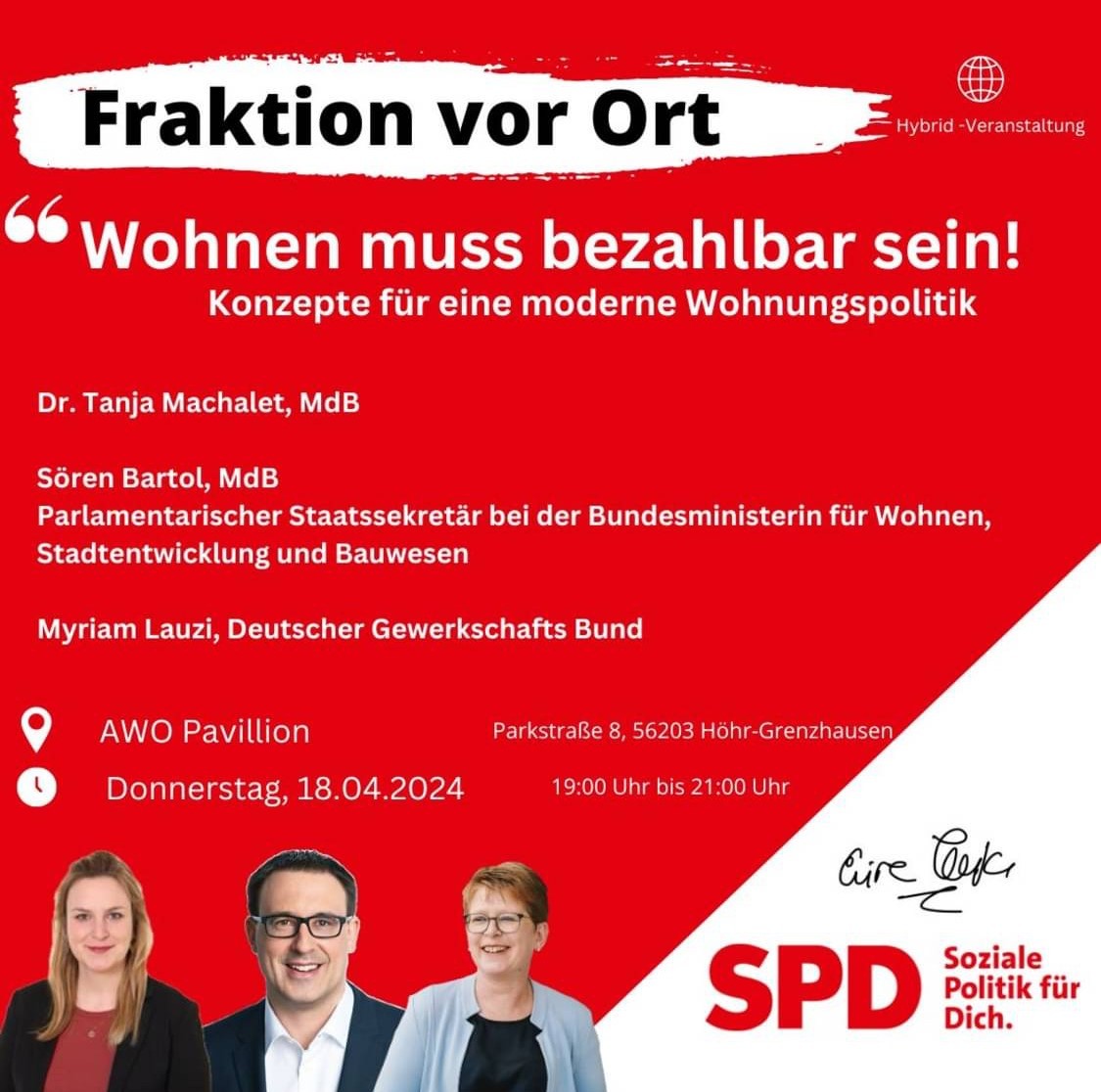 tarischer Staatssekretär im Bundesministerium für Wohnen, Stadtentwicklung und Bau-wesen, laden zur Diskussionsveranstaltung „Wohnen muss bezahlbar sein – Unsere Konzepte für eine moderne Wohnungspolitik“ am Donnerstag, den 18. April 2024 um 19:00 Uhr in den AWO-Pavillon nach Höhr-Grenzhausen ein.